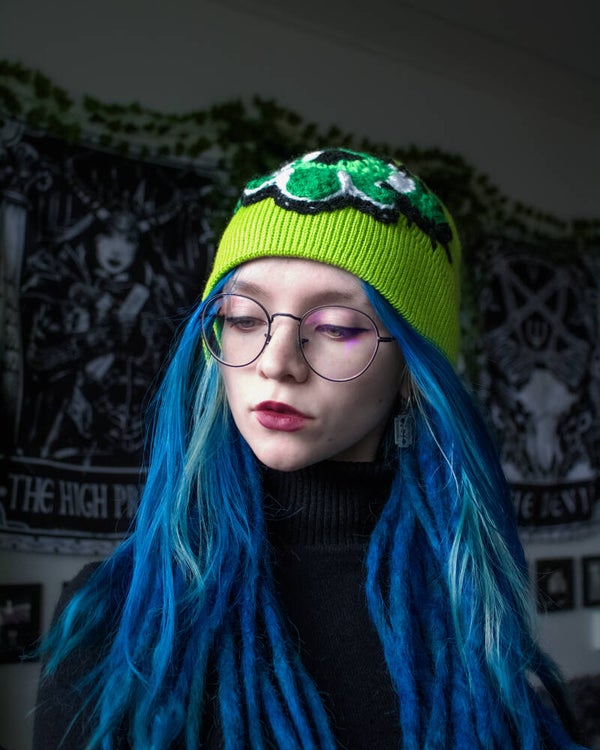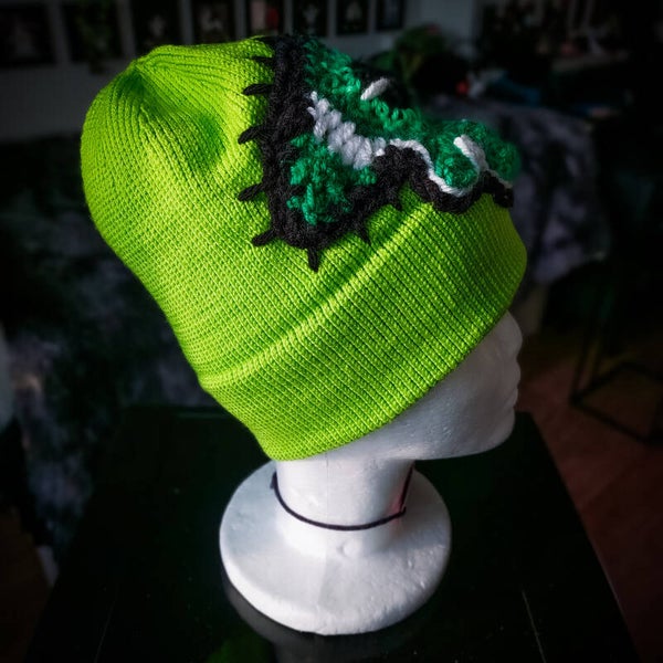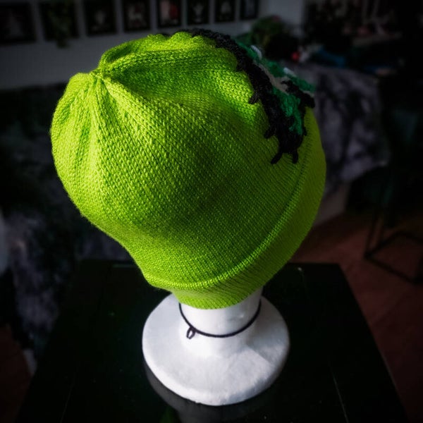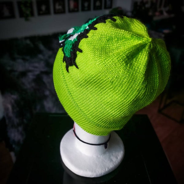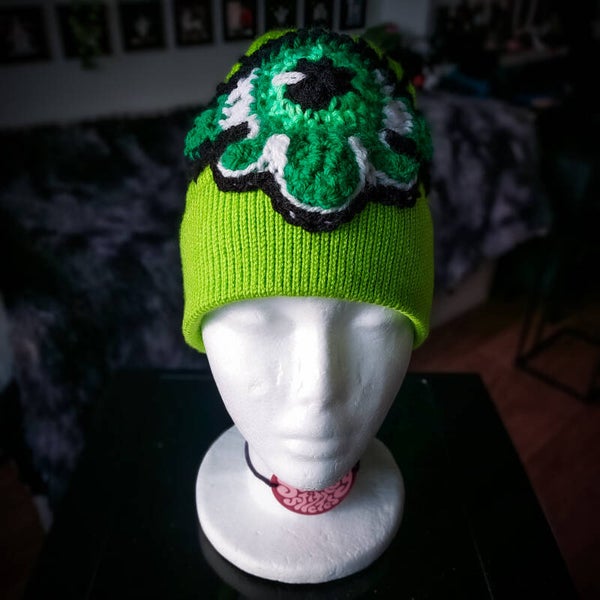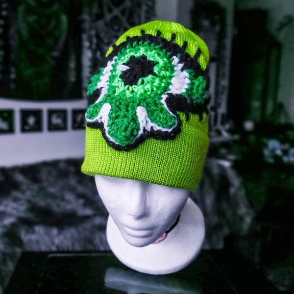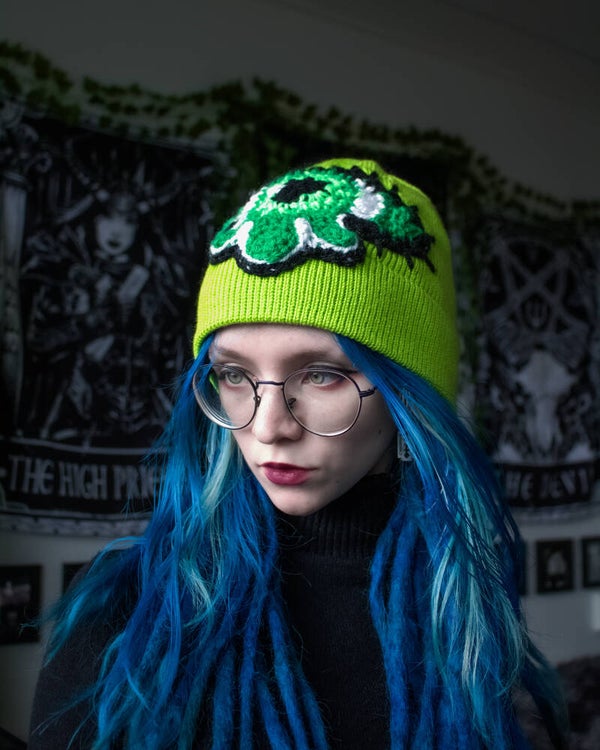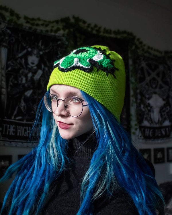 Beanie made on a hand-operated domestic knitting machine. Eye crocheted & embroidered by hand.