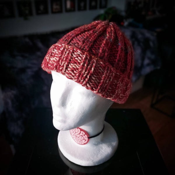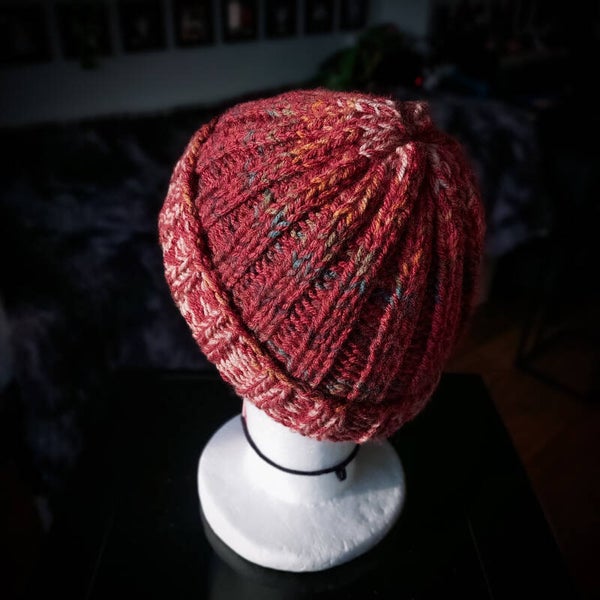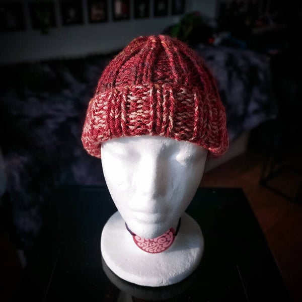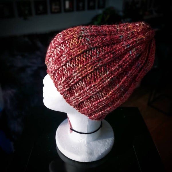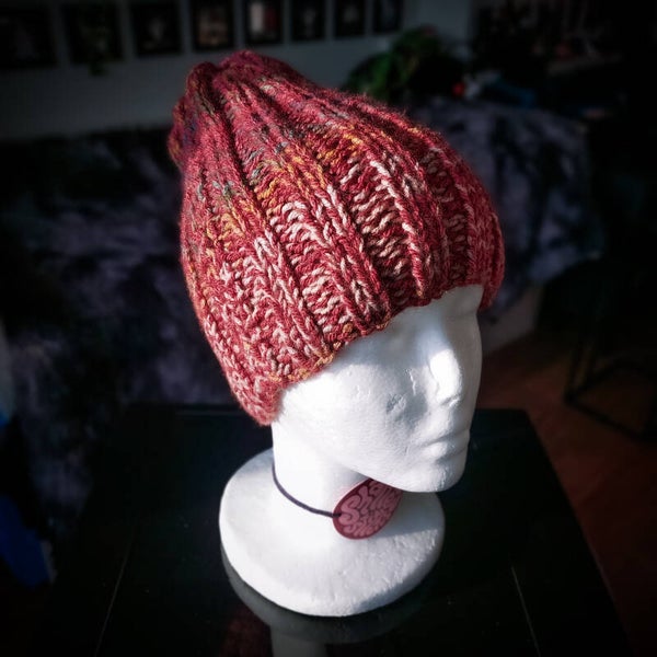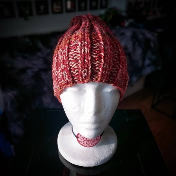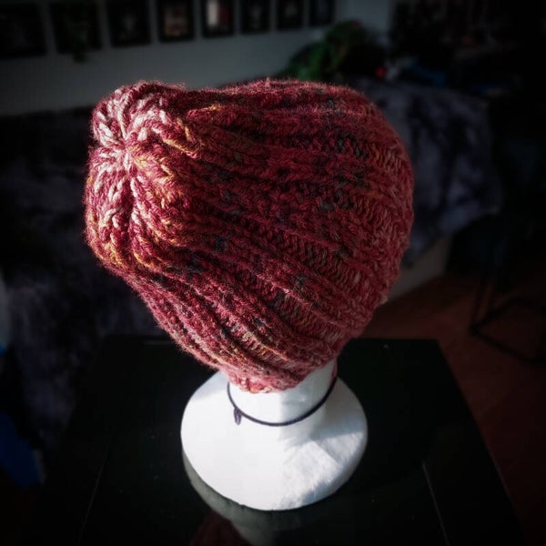 One of a kind, hand knit beanie, one size fits all, very stretchy.
