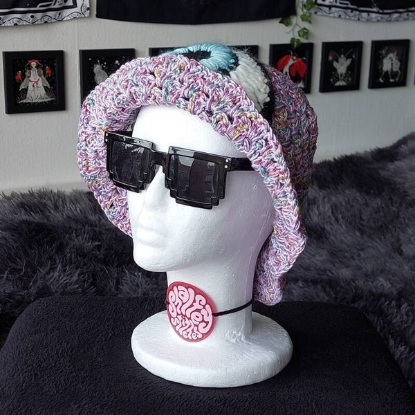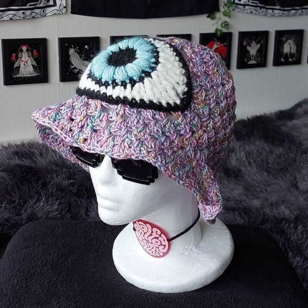One of a kind crocheted bucket hat, with a big eye applique.