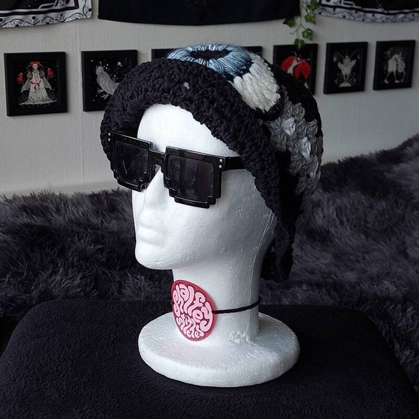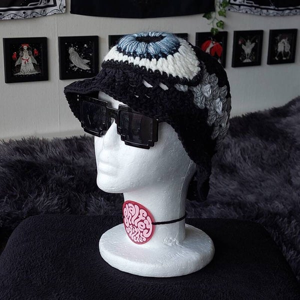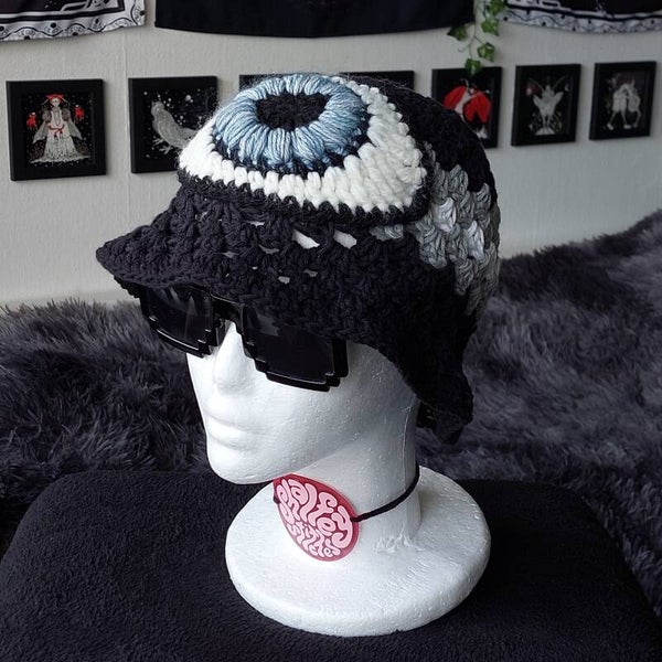 One of a kind crocheted bucket hat, with a big eye applique.