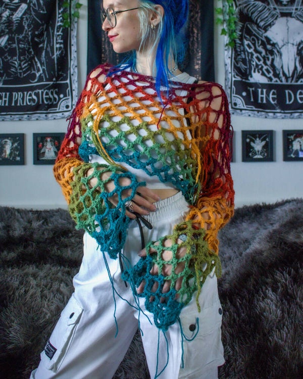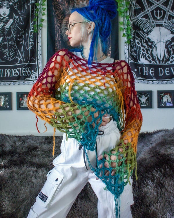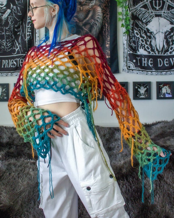 Fishnet Longsleeve Crop Top - Muted Rainbow