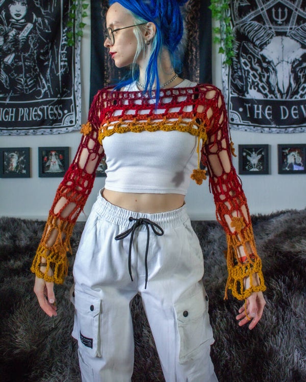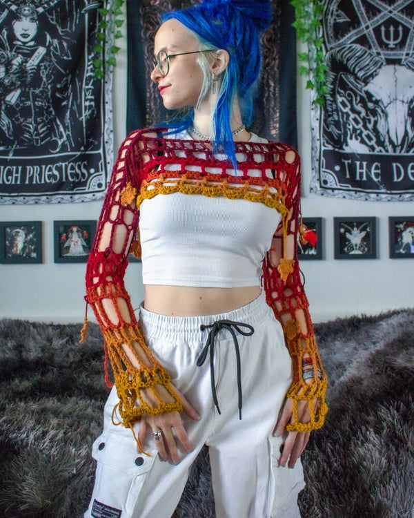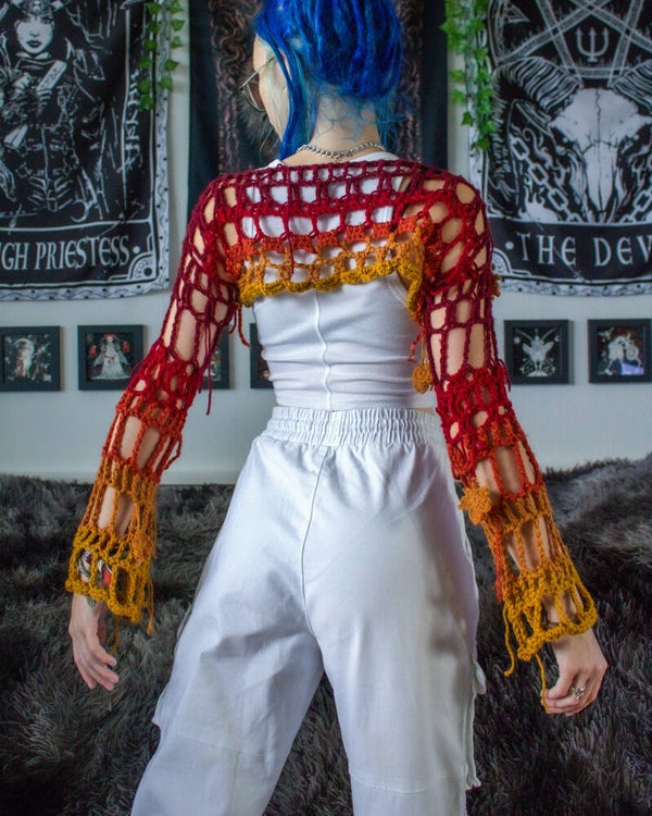One of a kind crocheted shrug. Straight sleeves. Features maple leaf decorations. Fully handmade.